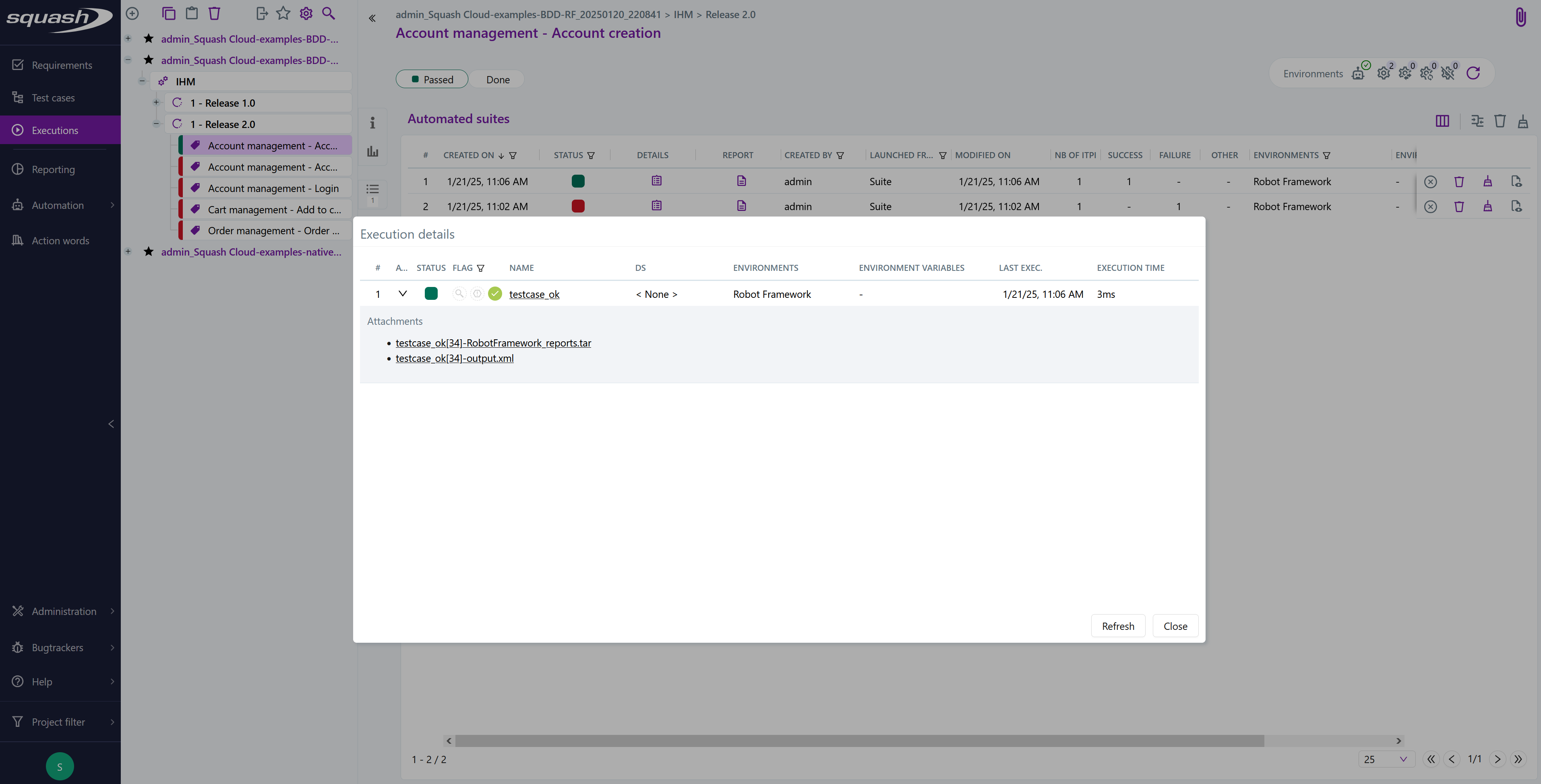 Success,Failure, orBlocked. Execution reports and attachments for the automated test are available from the Automated suites tab.