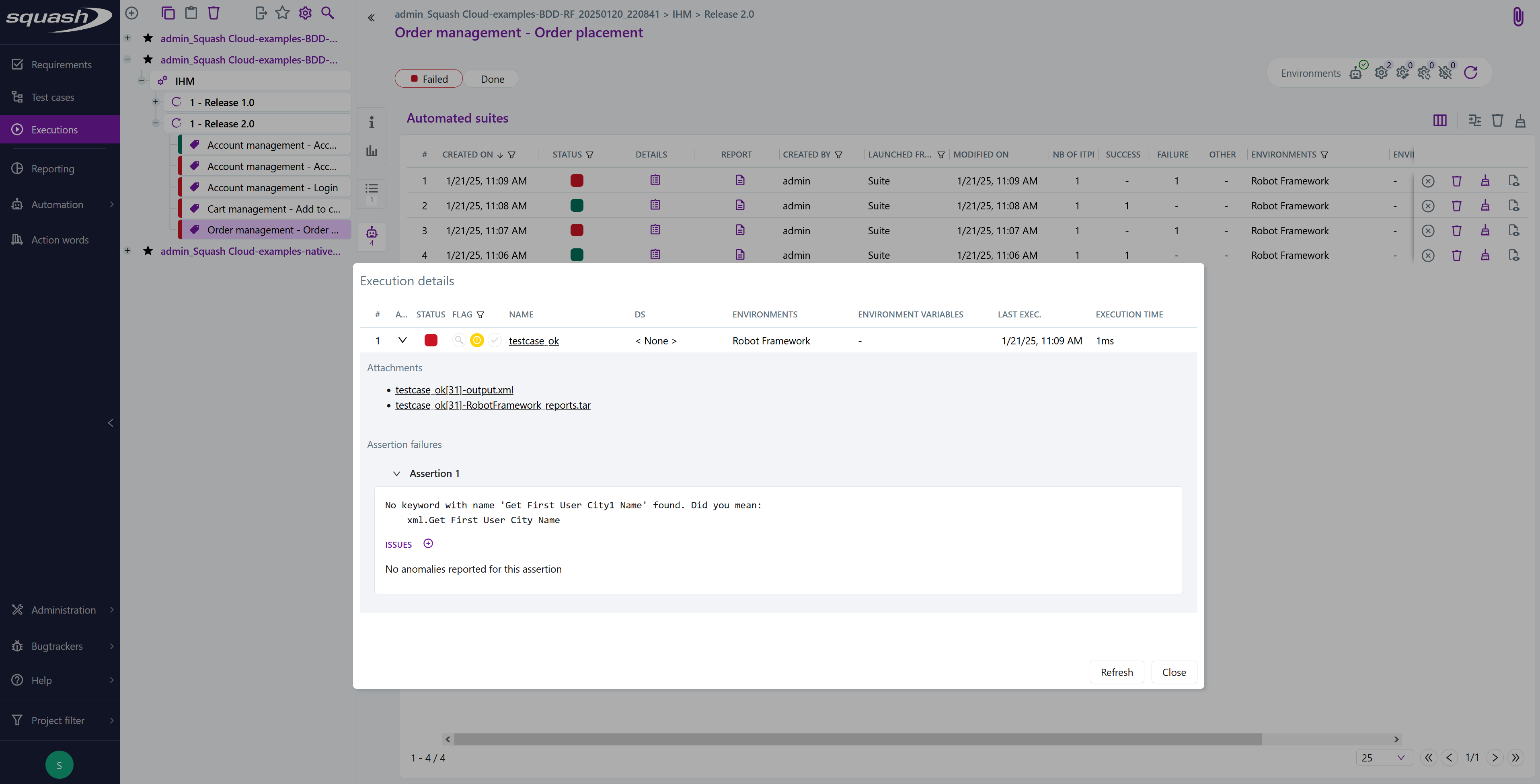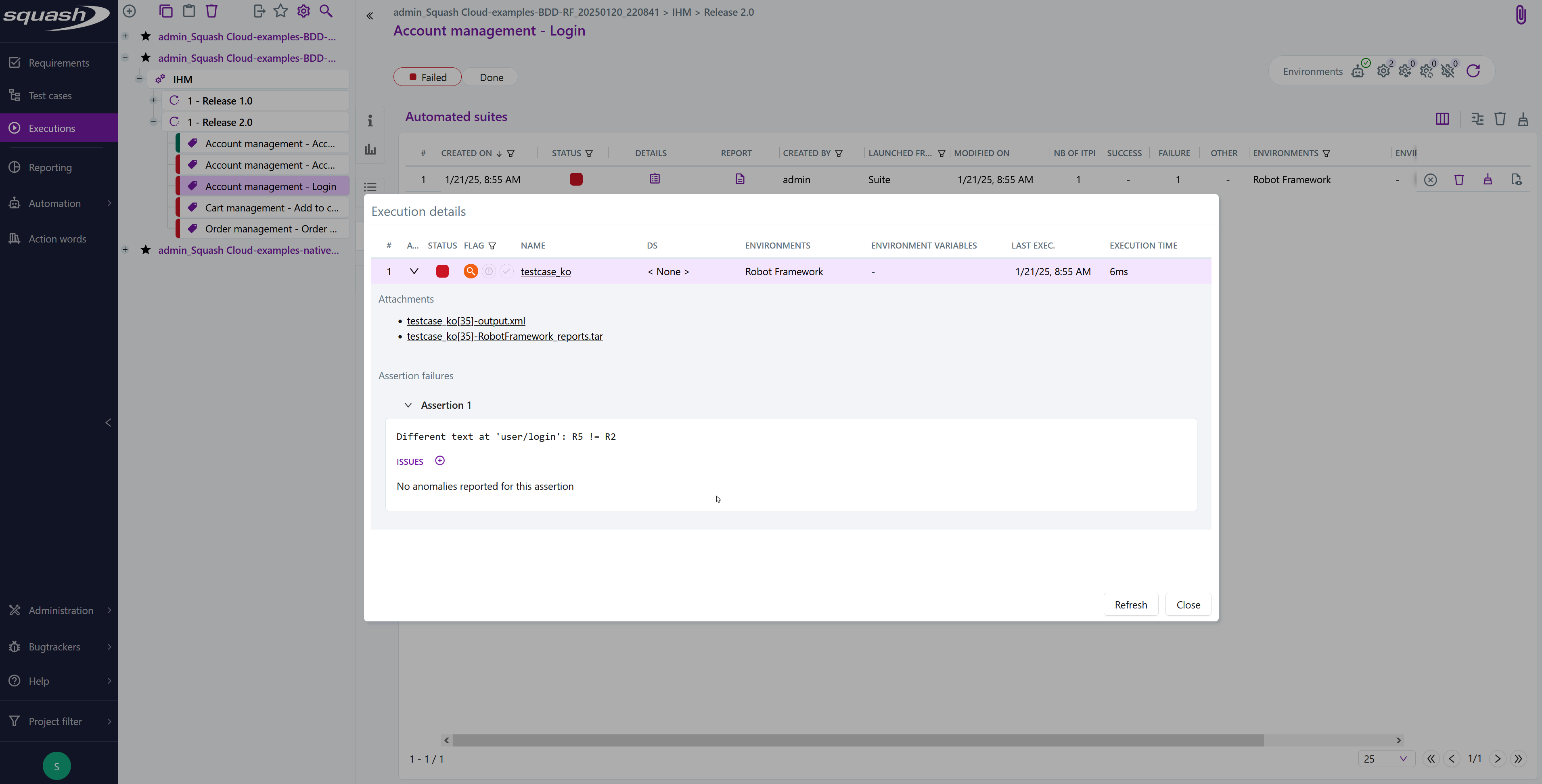 For automated executions run with SquashTM Orchestrator having the status "Failed", assertion failures are available in SquashTM.