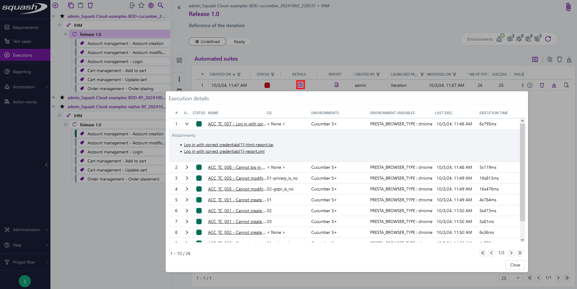 Reports and attachments for the different executions are also accessible from the Execution screen (they are present in the attached files).