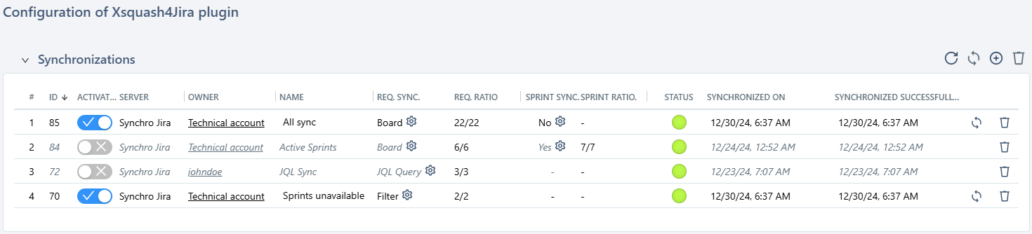 Once you have configured the synchronization, an additional row appears in the synchronization table. During the next update, all the synchronized requirements and sprints corresponding to the perimeter will be created. If the synchronization fails, nothing is created in Squash. The status of every synchronization is displayed in the synchronization table, as well as the number of items (requirements and sprint tickets) successfully synchronized versus the total number of synchronized items.