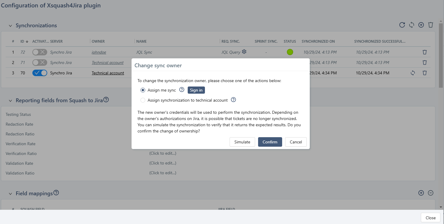To do so, when clicking on a synchronization owner, a pop-up window allows the user to assign the synchronization to himself/herself or to the technical account. They can also do a synchronization simulation to make sure that the synchronization brings back the expected issues with the new owner credentials.