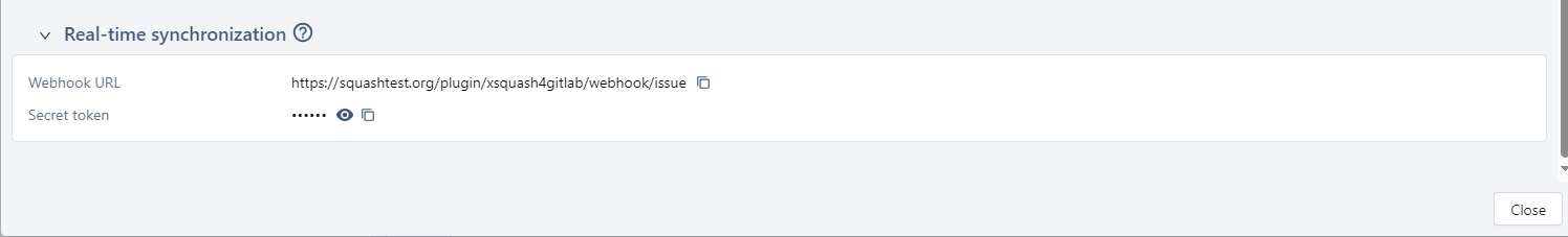 - The Real-time synchronization block gives the information needed to configure in GitLab the real time issues synchronization in Squash TM.
