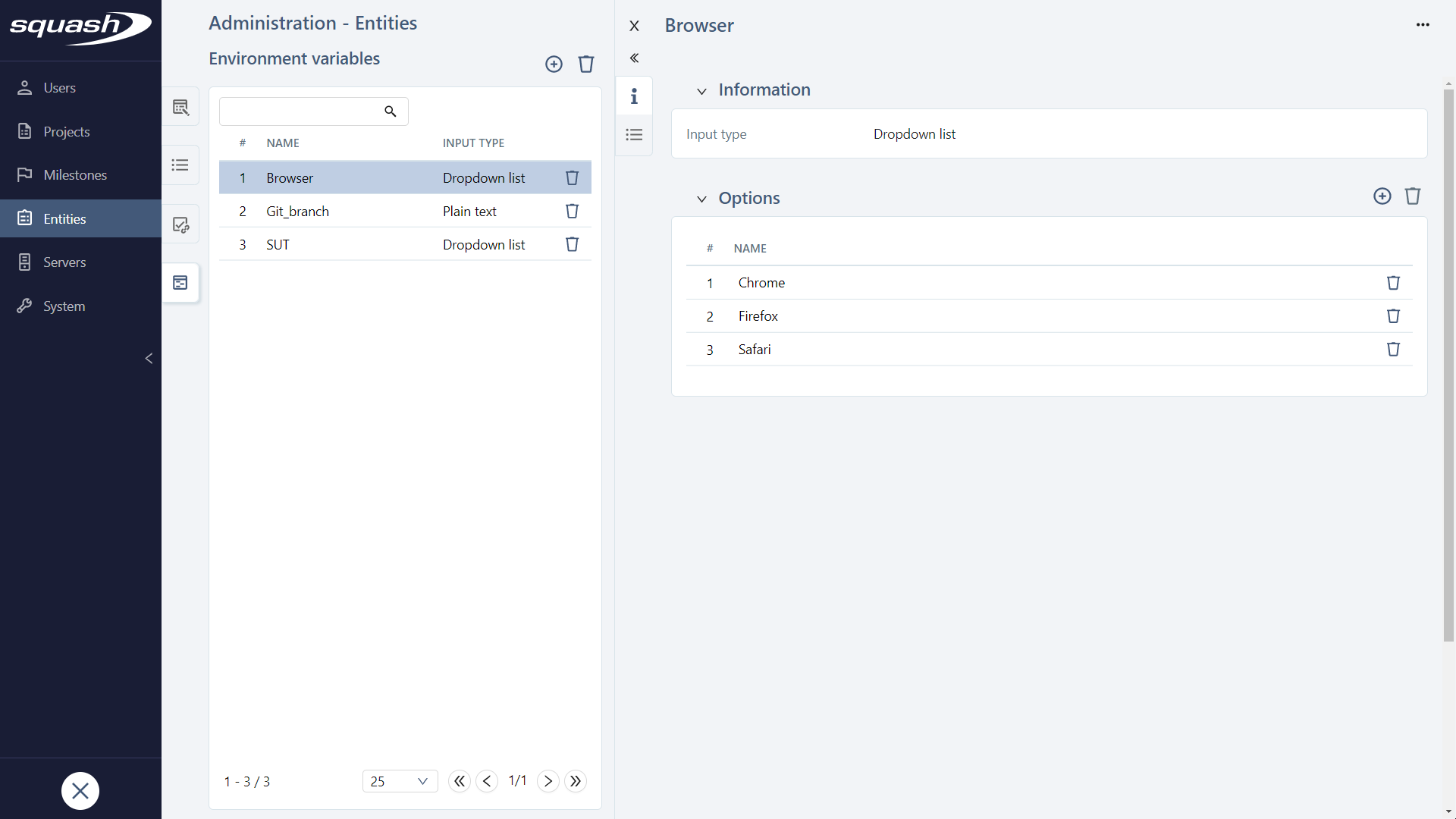 Once created, environment variables must be associated with a Squash Orchestrator test automation server or a project.