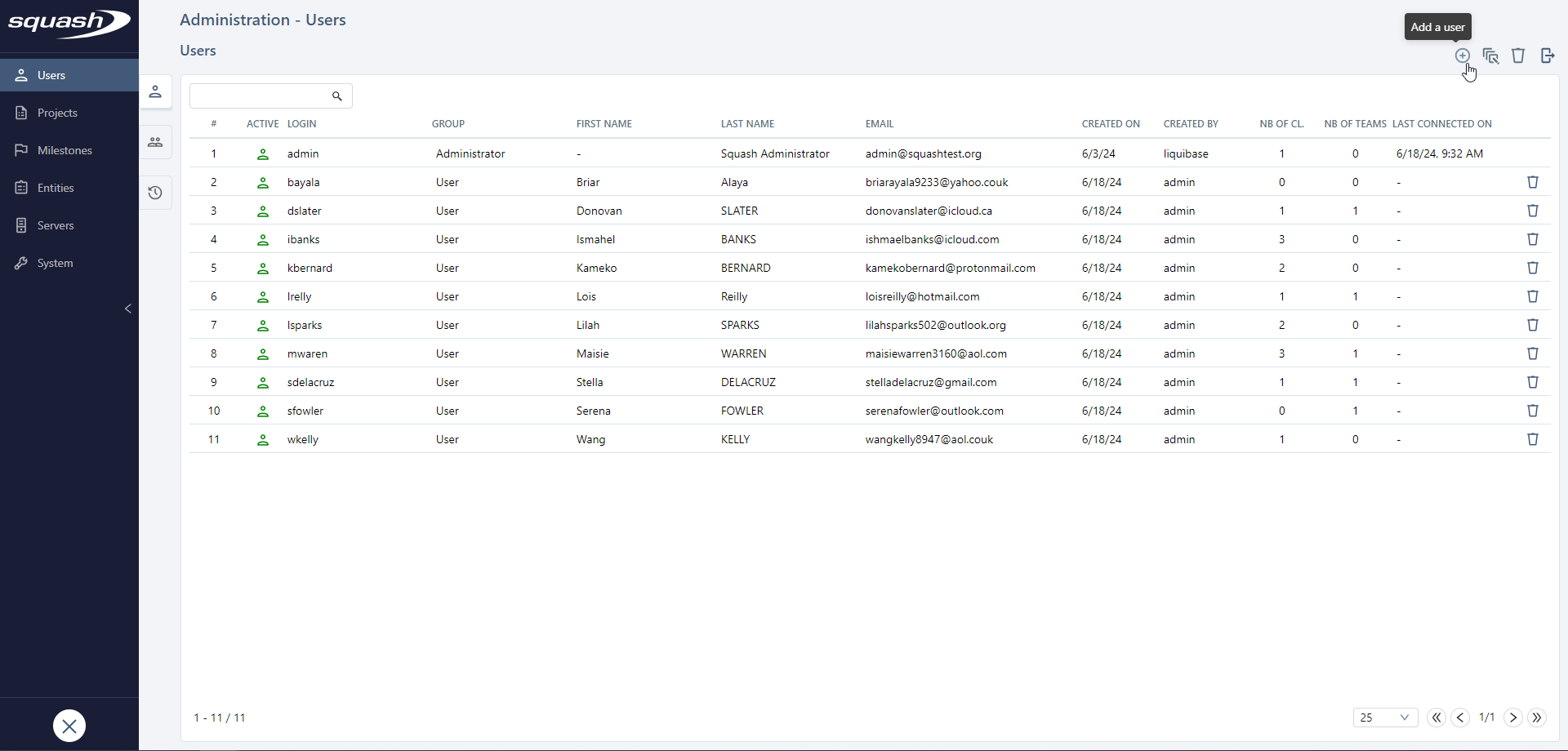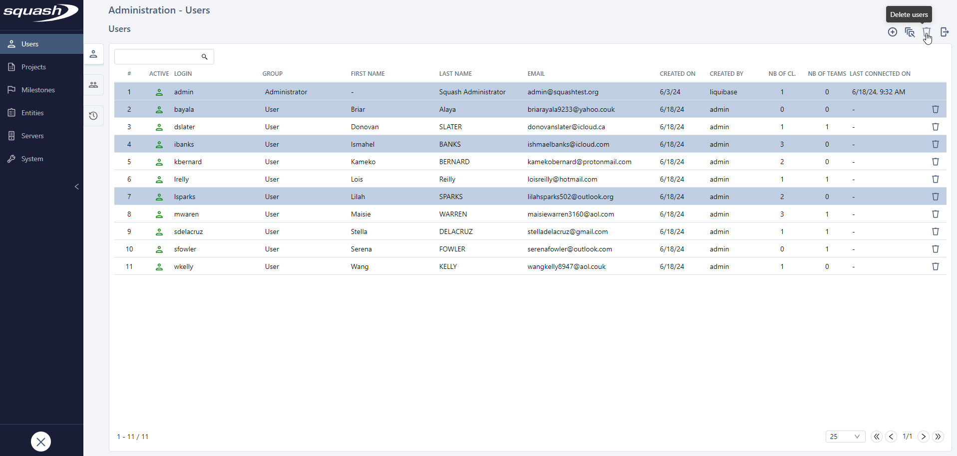 The following features are available for all the management tables of the Administration workspace.