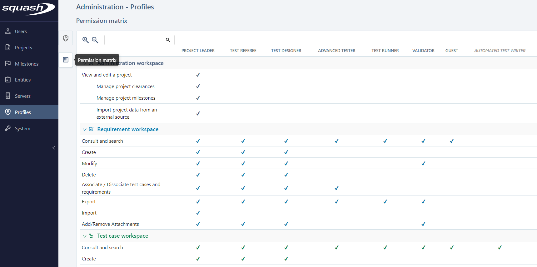 The permission matrix, accessible from the anchor Matrix, allows users to visualize the permissions associated with each profile, providing a clear and comprehensive overview centralized in one place.