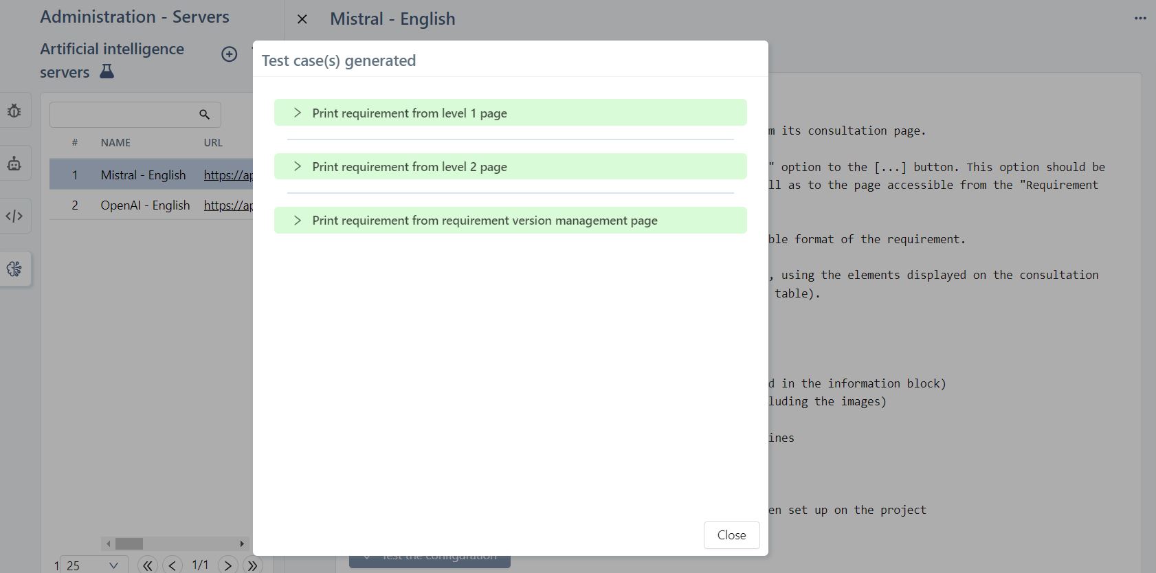 This is an experimental feature that allows the generation of test cases from a requirement. It will be enhanced in the future, particularly thanks to feedback from our users on this first version.