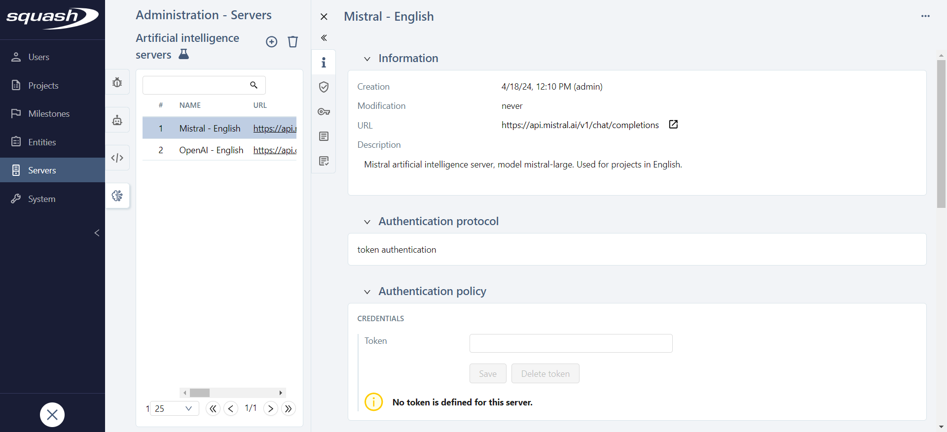When creating a server, the Name and URL fields must be filled in. The URL must correspond to the URL of the artificial intelligence server API. This information can be found in the API documentation of the chosen server.