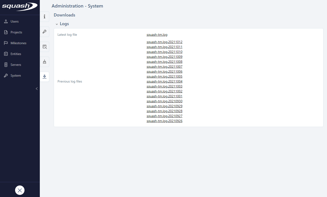 You can download Squash log files directly from the System submenu in the Administration workspace, in the Downloads anchor.