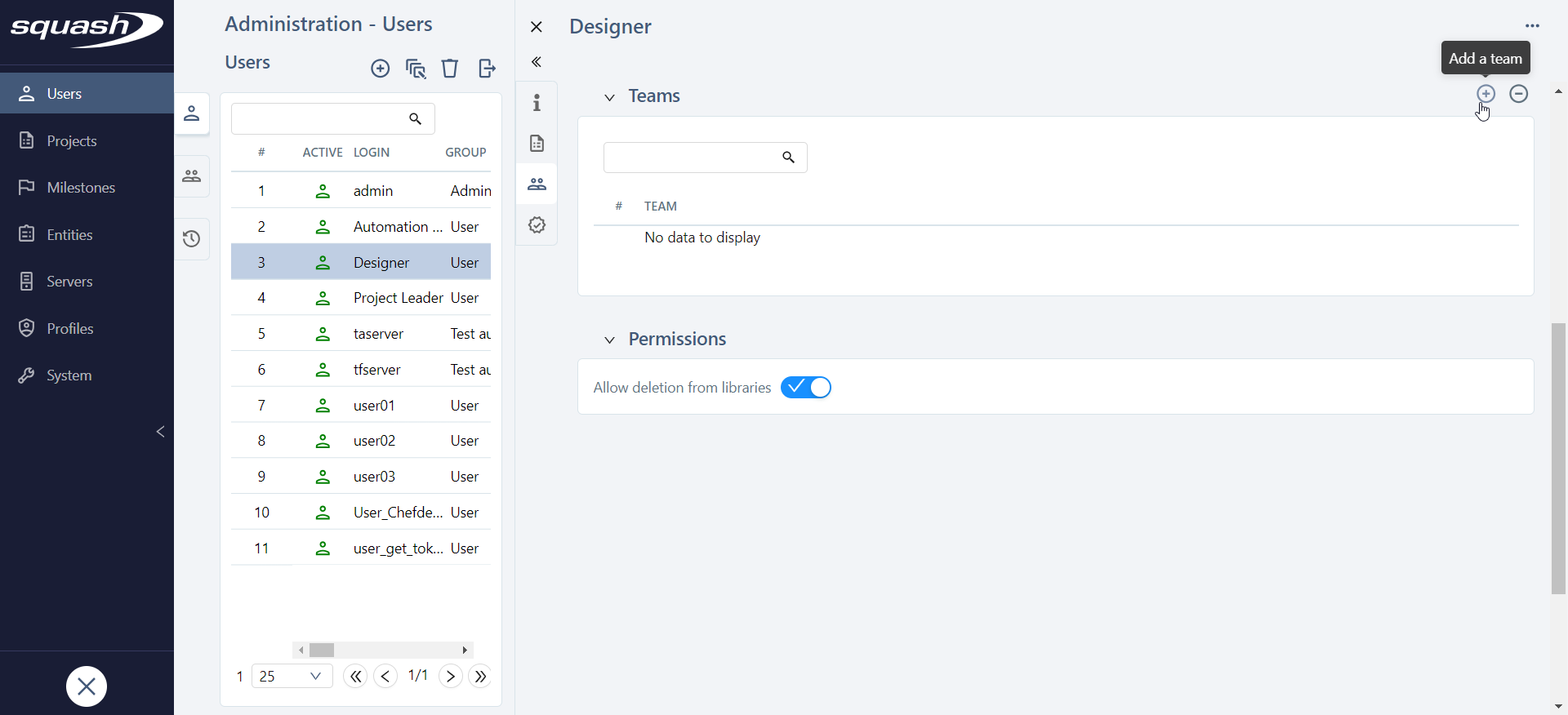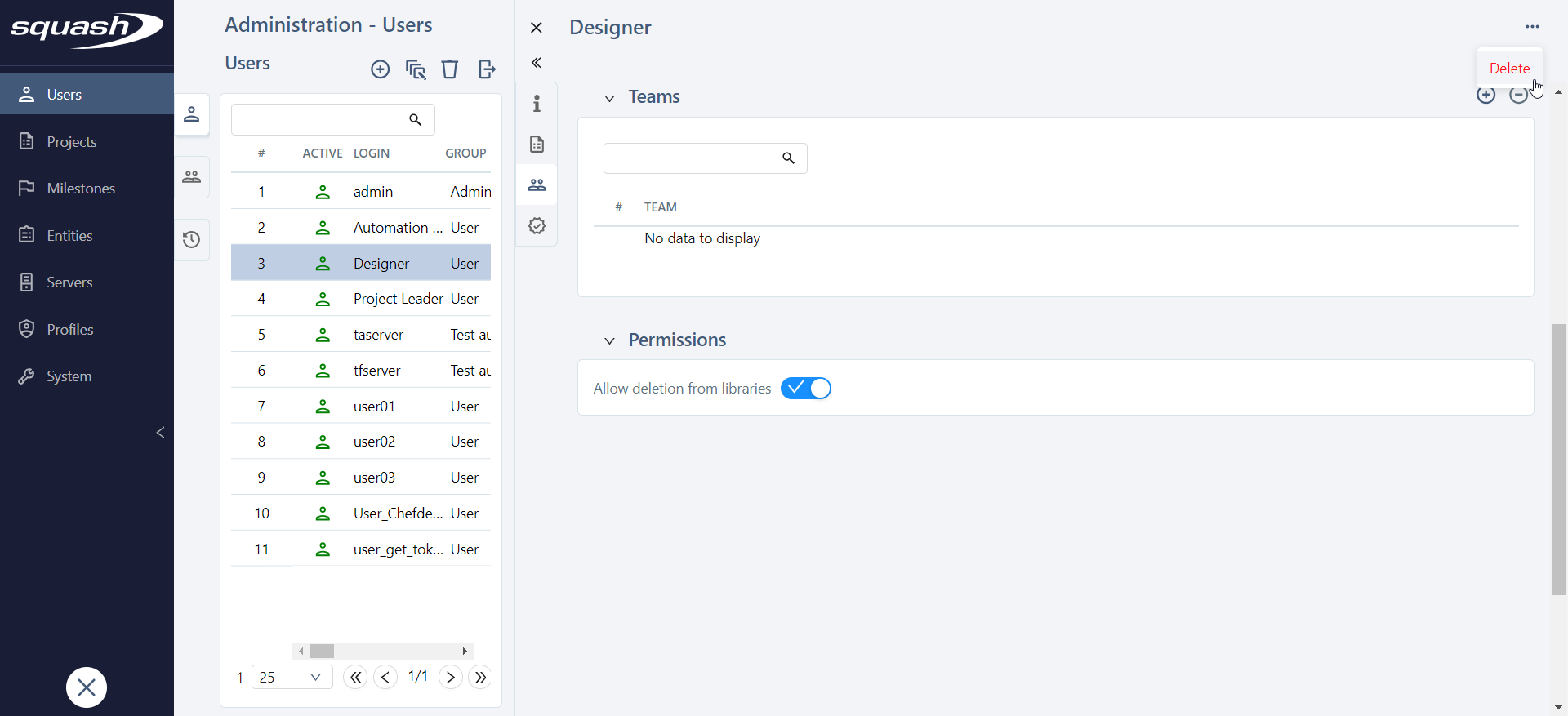 Deleting a user also removes him/her from a team's list of members, deletes his/her personal API tokens and forbids him/her to log into Squash TM. However, the objects this user has created will remain.