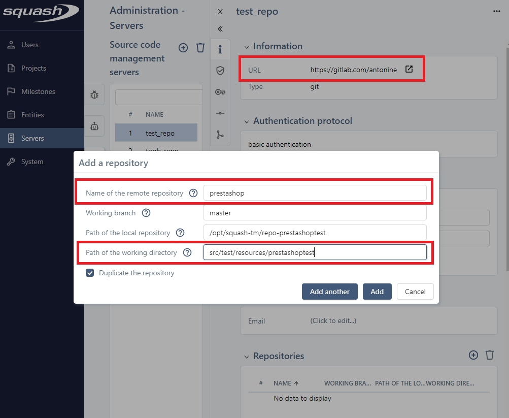 In order to be able to finish the configuration of the project, Annita needs the Git repository information. So she asks Antonine to create the repository and, in it, the directory into which Squash TM will push the automated test cases.