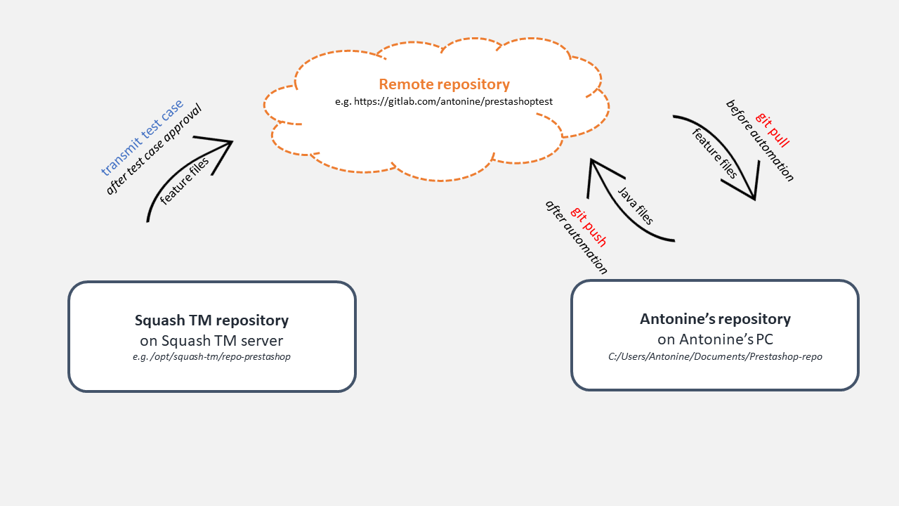 Antonine uses a local repository on her PC. She retrieves the scripts generated by Squash TM by performing a git pull and pushes her automation code with a git push.