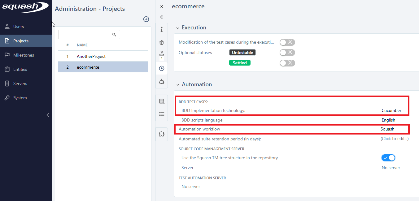 She sets the project as BDD with Cucumber and the automation workflow as managed by Squash TM: