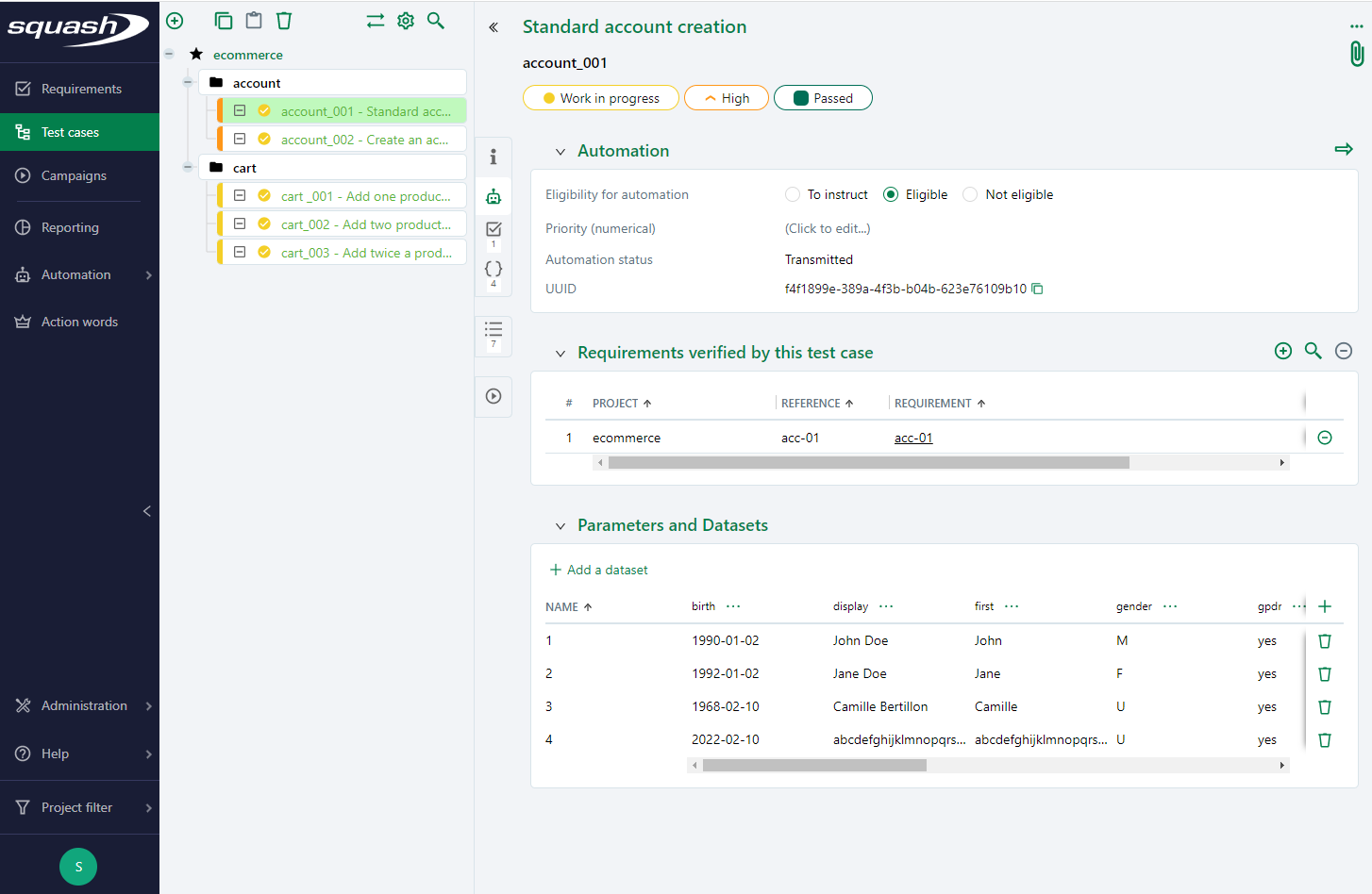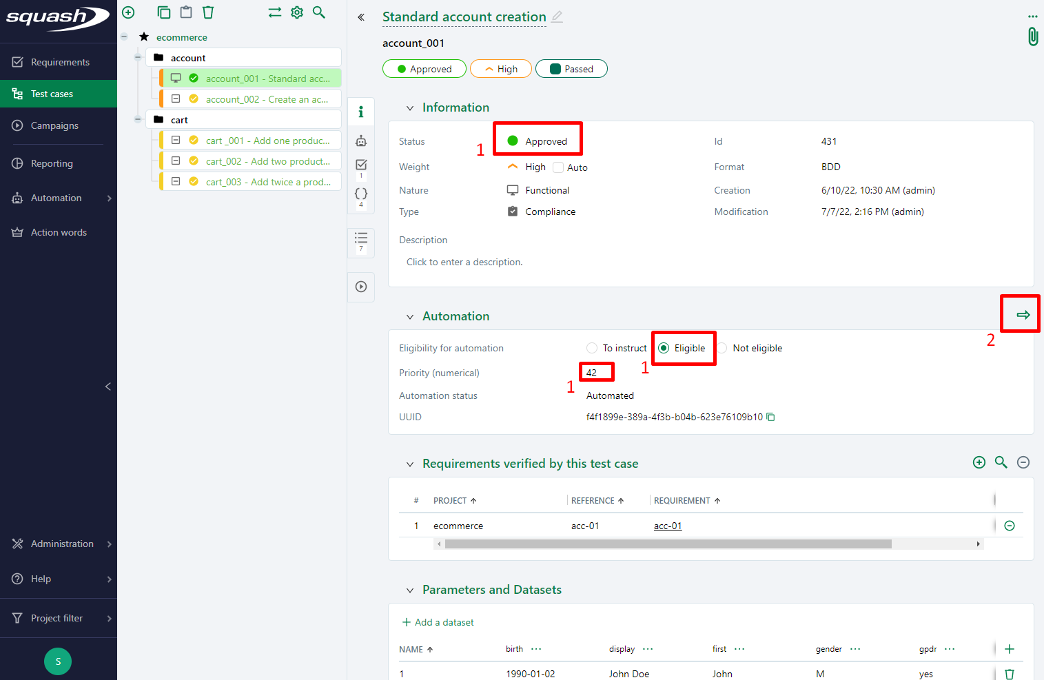 Once a test case has been reviewed and approved (see Squash TM documentation), Fabrice flags it as eligible for automation (see Squash TM documentation) and, optionally, defines an automation priority. He can now transmit the test case by clicking on the arrow: