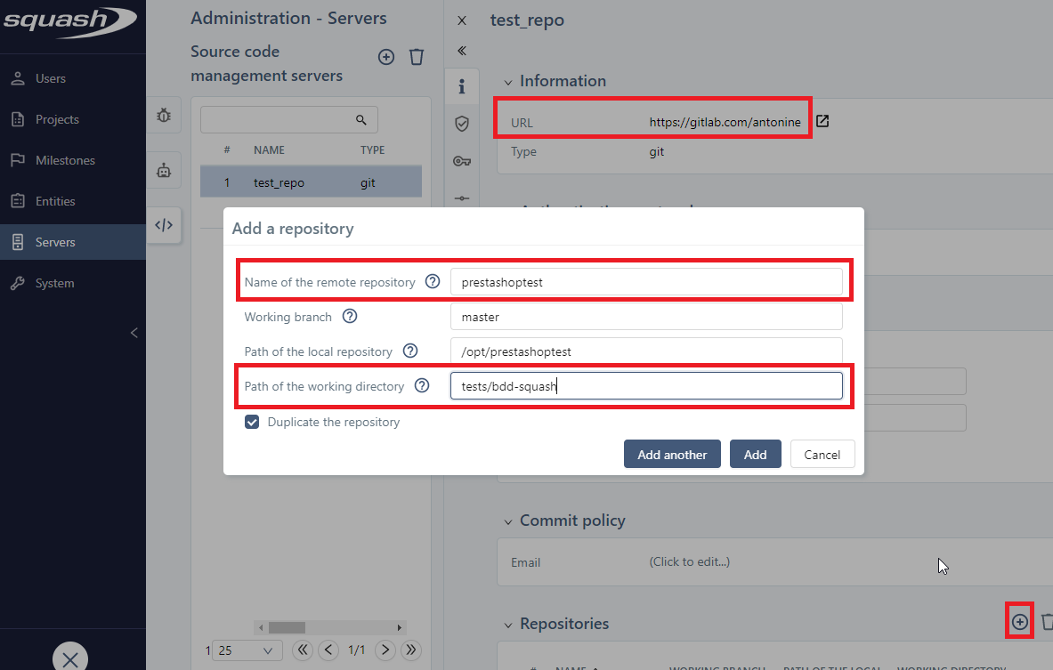 In order to be able to finish the configuration of the project, Annita needs the Git repository information. So she asks Antonine to create the repository and, in it, the directory into which Squash TM will push the automated test cases.