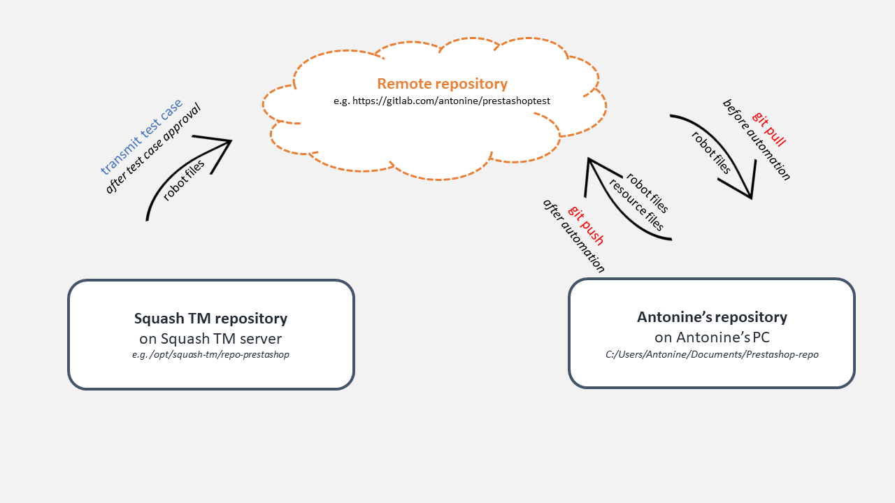 Antonine uses a local repository on her PC. She retrieves the scripts generated by Squash TM by performing a git pull and pushes her automation code with a git push.