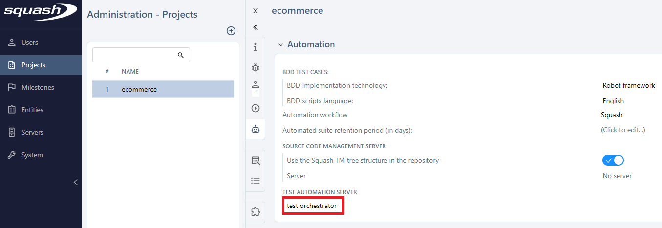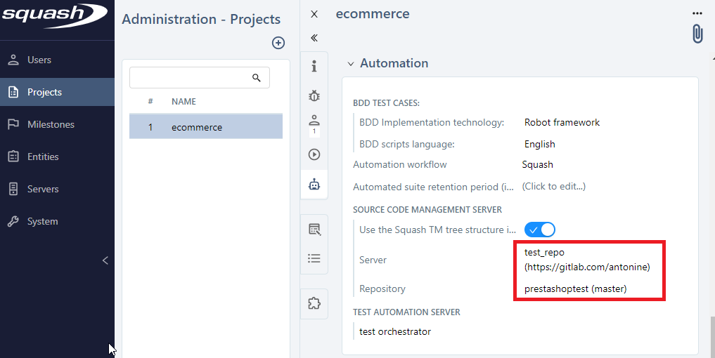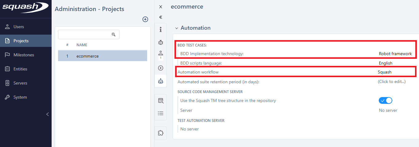 She sets the project as BDD with Robot Framework and the automation workflow as managed by Squash TM: