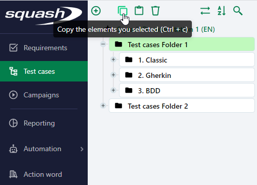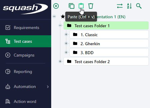 - When the selected item cannot be copy-pasted in the target item, the button is grayed out. For example, a folder cannot be copy-pasted in a requirement; a test case cannot be copy-pasted in another test case or in another iteration within the project.