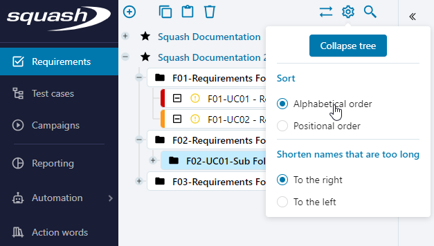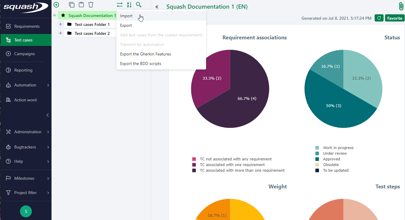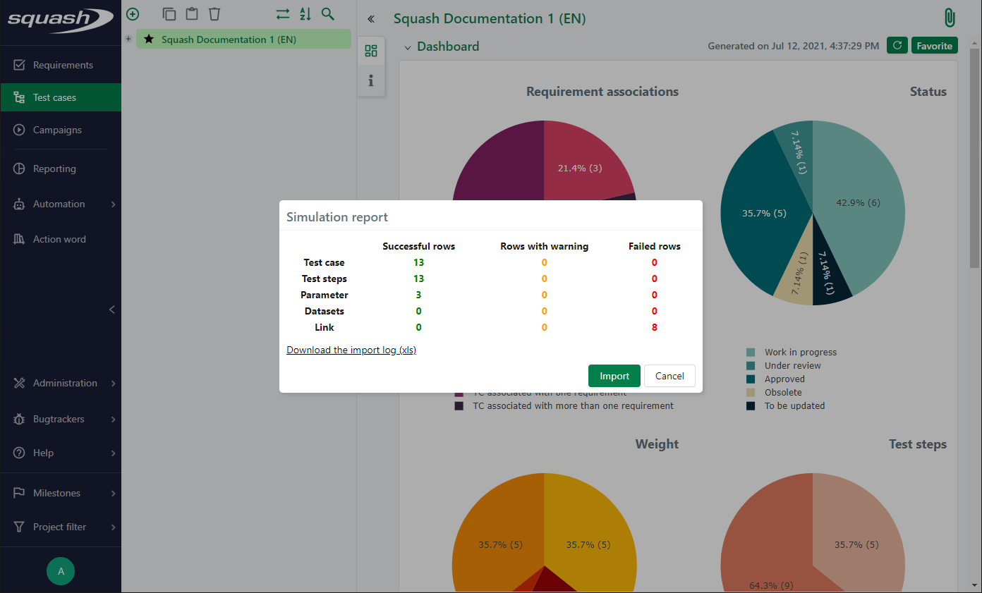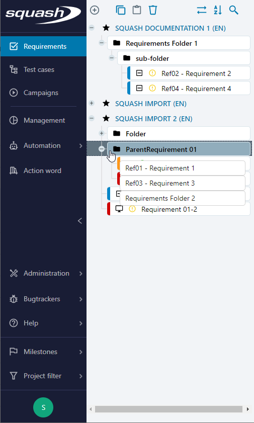 The import function allows you to mass import a tree of items in the Requirement or Test case workspaces. It is also possible to import items from a same file into different Squash projects.