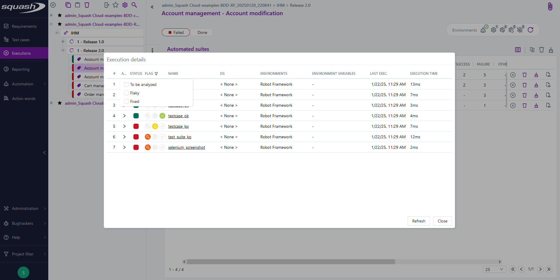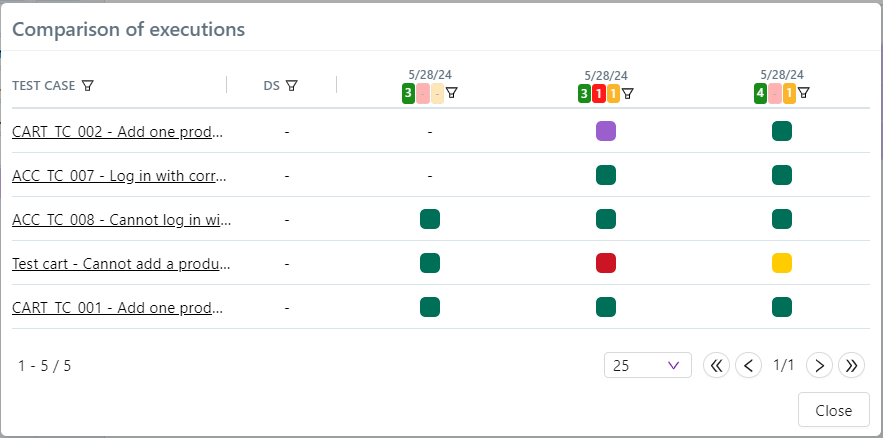 Comparing execution statuses is a feature available with the Squash Premium license and the Squash TM Premium plugin.