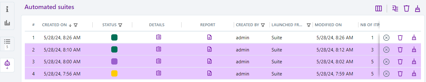 The suites are sorted by selection order, and the columns can be filtered and sorted by execution status.