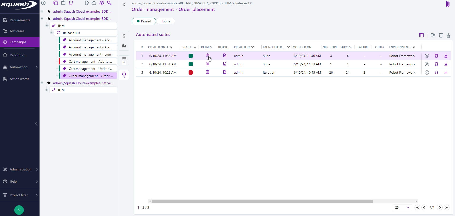 Success,Failure, orBlocked. Execution reports and attachments for the automated test are available from the Automated suites tab.
