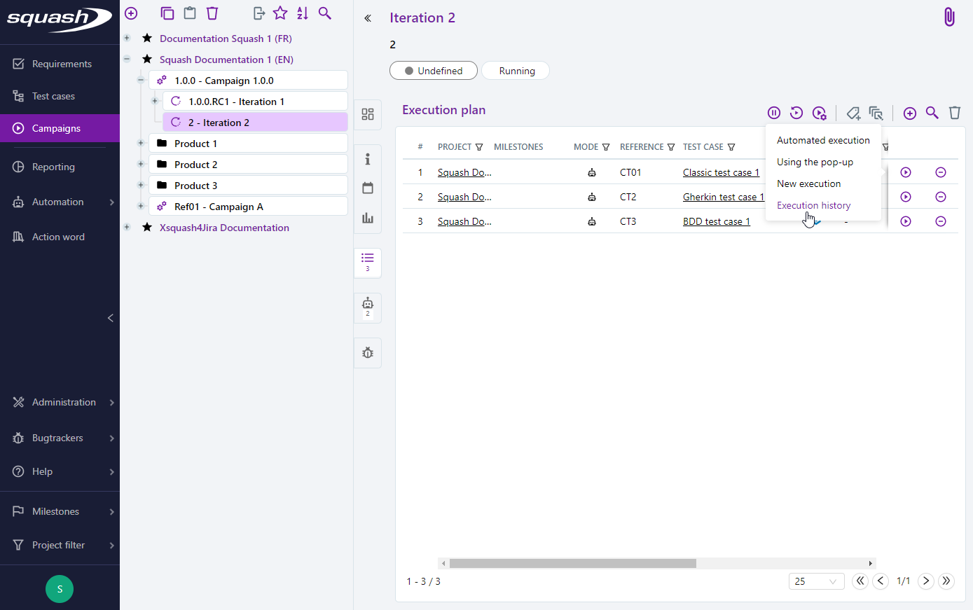 - A new execution is created for each test plan item, see the Squash TM glossary) as each test is executed. It has a status corresponding to the result of the automated test: