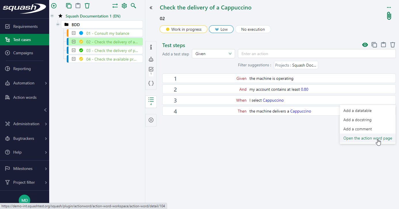 From the Test steps tab of a BDD test case, you can directly access an action's consultation page by clicking on the button [...], then on Open the action word page:
