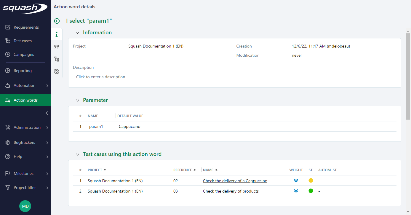 • The "Test cases using this action word" block enables you to view the information on the test cases that use the action. By clicking on the name of the test case, its consultation page appears;
