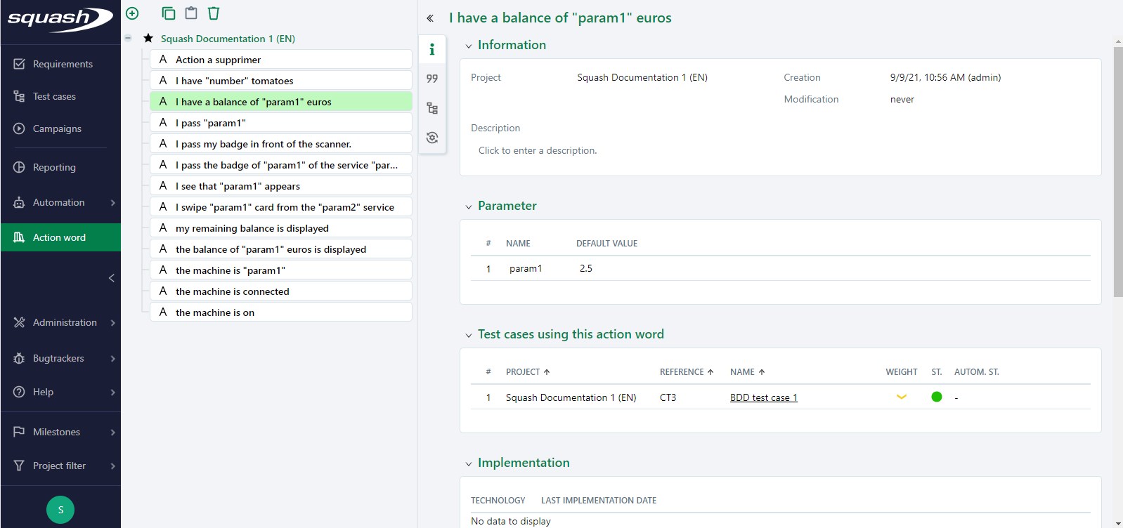 • The Last implementation date column indicates the date when a test case using the action switched to the "Automated" status for the last time.