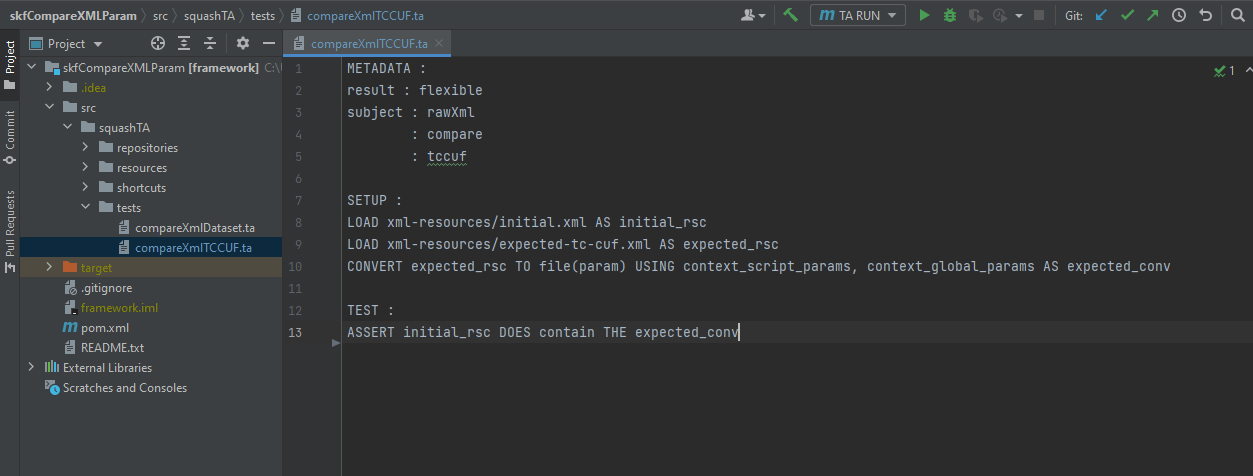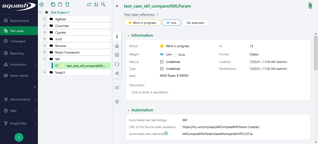 Below is an example of a SKF project using a parameter in a XML file and the corresponding Squash TM test case automation: