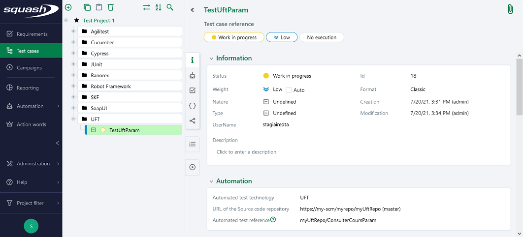 Below is an example of a UFT solution and the corresponding Squash TM test case automation: