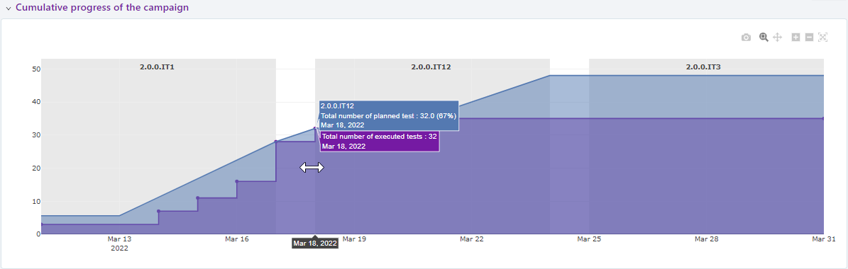 The Cumulative progress of the campaign graph is generated from the Cumulative progress of the iteration graphs. They are generated automatically from the dates given in the Scheduling block of the iteration. It is a graphical representation of the cumulative progress of the object taking into account the dates of the campaign, the iterations and the number of test cases to be done. The graph proposes a representation allowing to compare the achieved (purple curve) and the planned (blue curve) and thus to evaluate the cumulative progress of the campaign or the iteration.