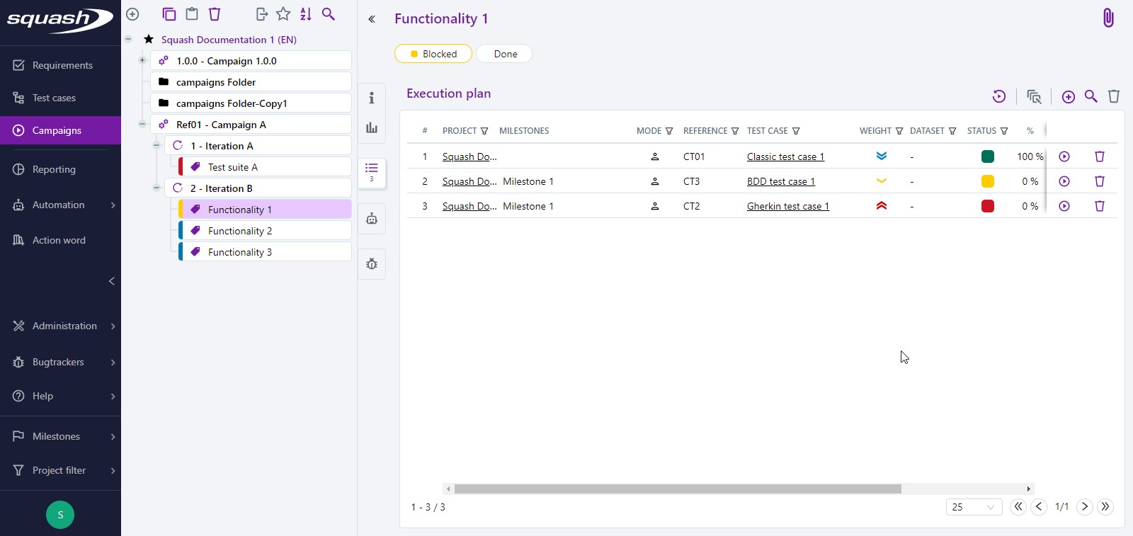 The block Execution plan of an iteration or test suite contains action buttons enabling you to execute successive tests.
