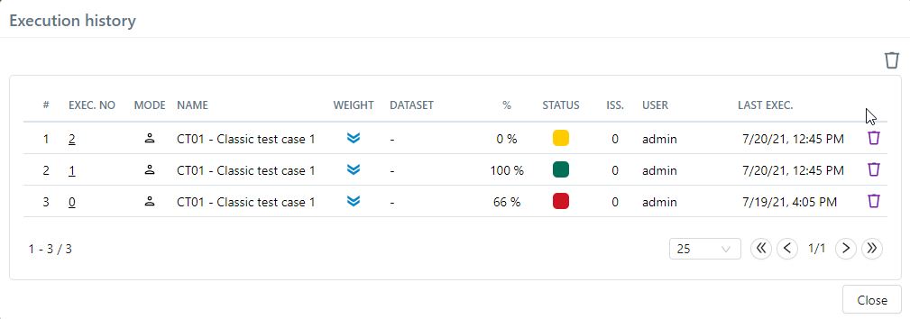 The Executions history pop-up appears and lists all the item's executions, with their test step percentage with a passed status, their execution status, the user who executed the test, and the last execution date.