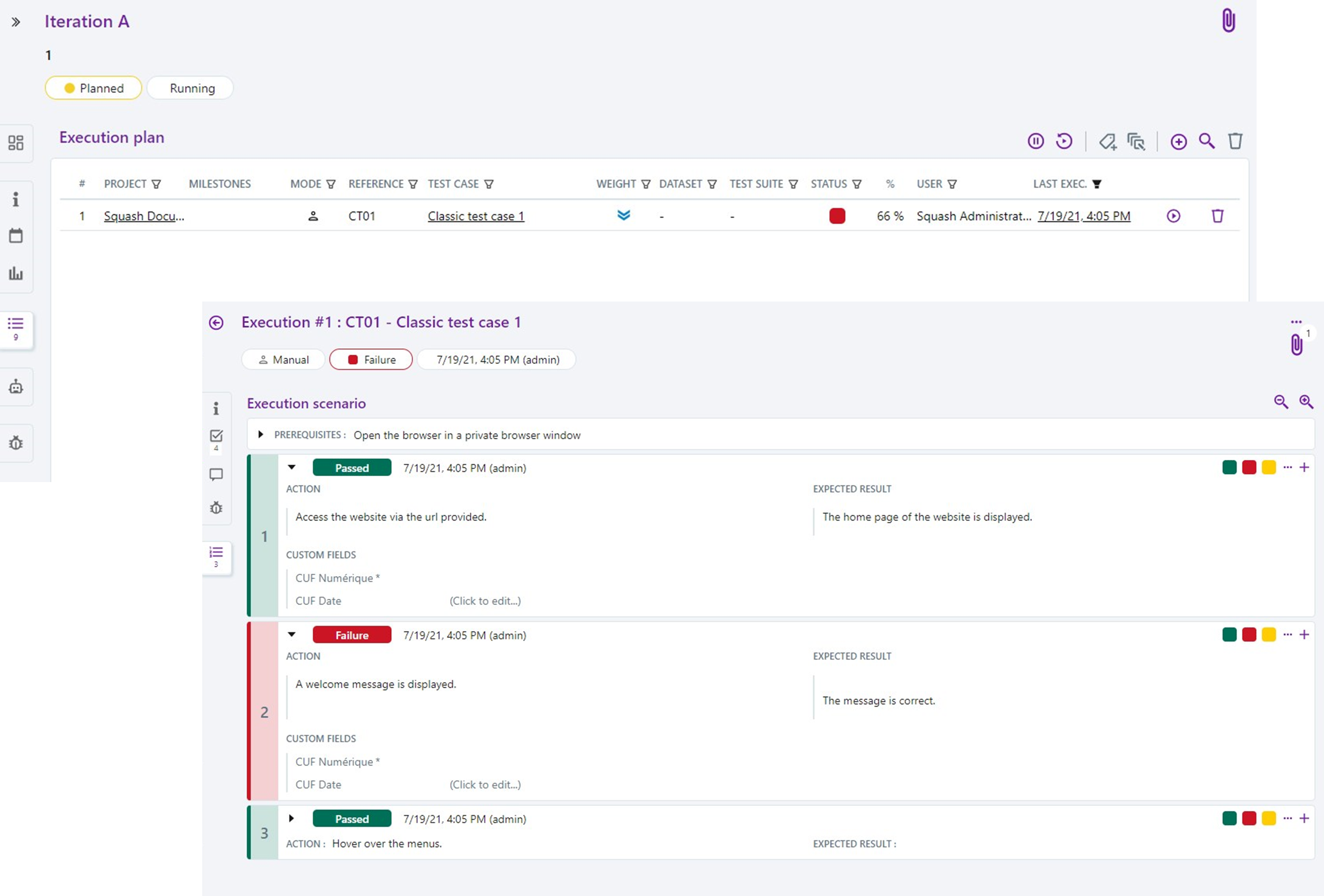 - a tab Custom fields linked to the test step (read-only) and to the execution step (editable);