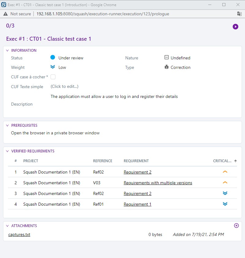 - the Information anchor which contains the test case's progress status, weight, description, nature and type, as well as the custom fields linked to the test case (read-only) and to the execution (editable);