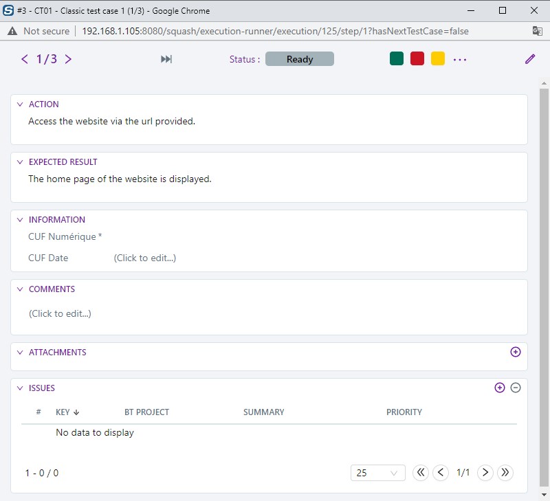 - from the execution's consultation page and the anchor Execution scenario by changing the execution status for every test step, adding comments and attachments, and reporting issues;