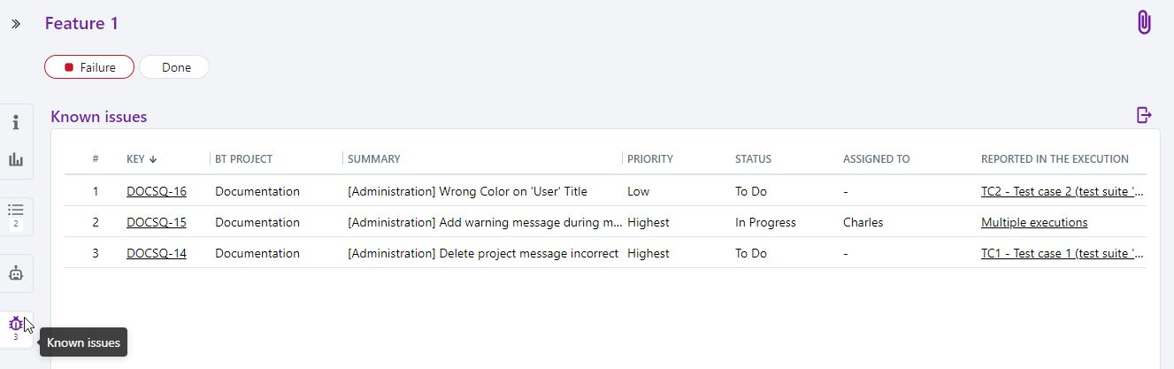 Issues reported during an execution or from an execution are added to the Known Issues anchor in the test suite, iteration, campaign, sprint or sprint requirement where the issue was found. For exploratory tests, issues are also displayed on the session page. A table with all the issues appears and the number of known issues is updated under the anchor's icon.