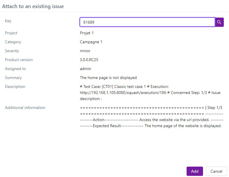 Once the issue is found, its information appears, and it can be added to the execution step or execution.