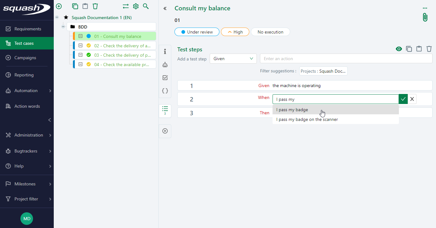 Squash Ultimate license 💎 also offers users suggestions for actions available in the library when entering or modifying BDD test steps.