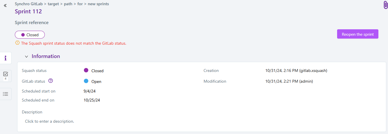 If the target sprint group is moved to another project or deleted from Squash TM, it will be recreated during the next update (in the original project) if it has not been closed or deleted from GitLab.