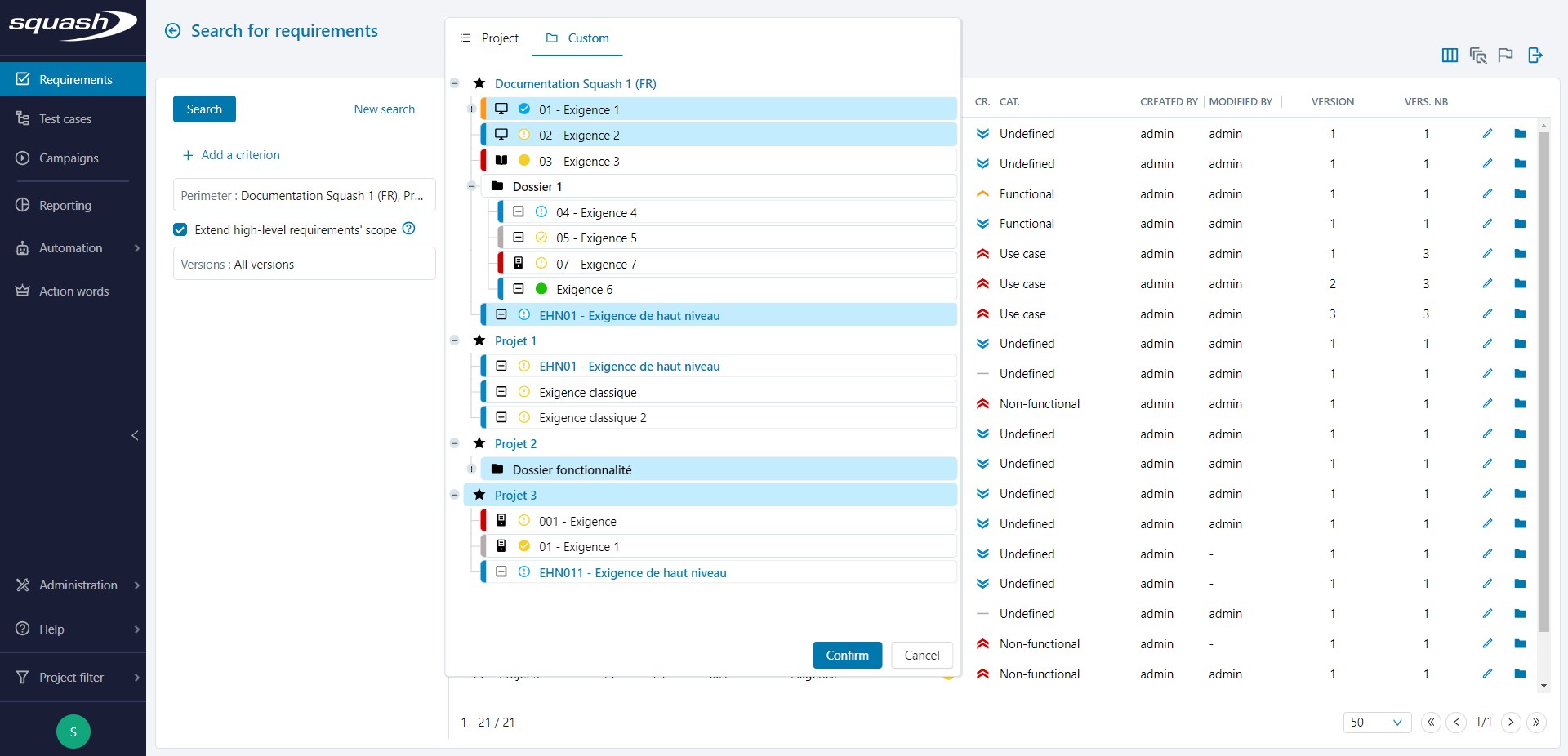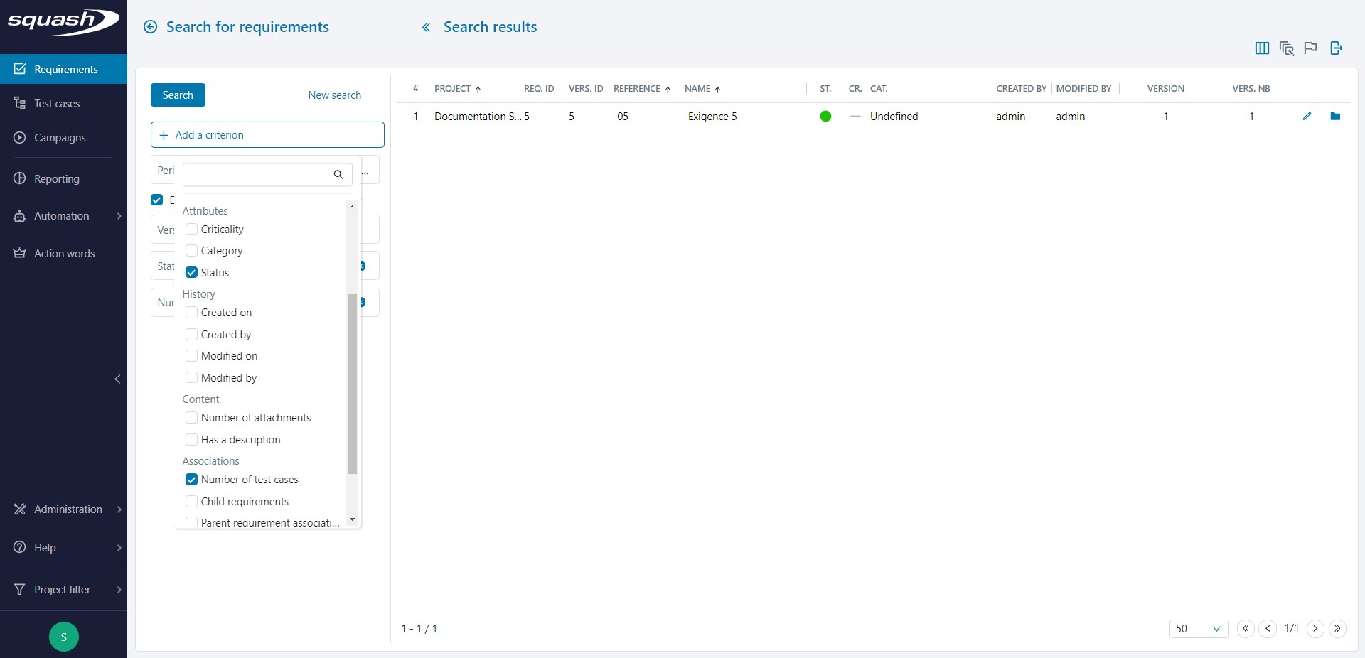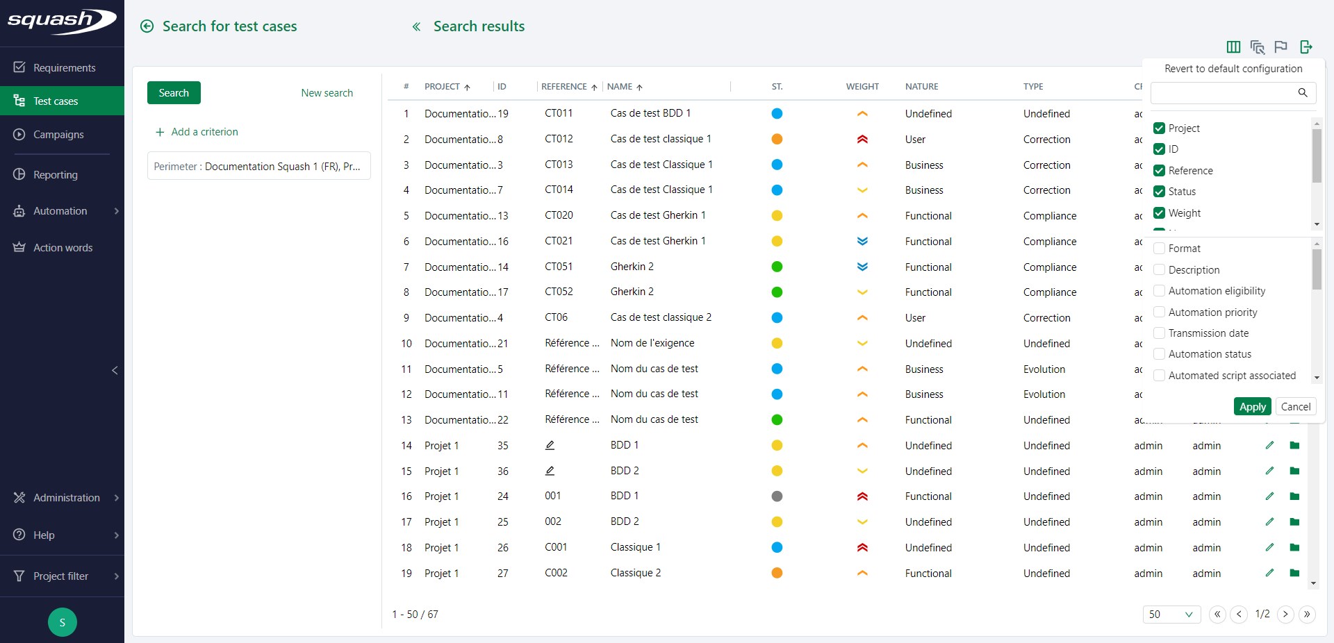 Configuring columns in search results is available with the Squash Premium license and the Squash TM Premium plugin.
