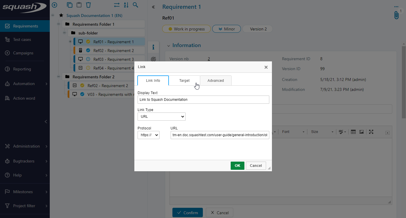Squash allows you to link objects: two requirements, a requirement to a test case, or a test case to an execution plan. There are 3 ways to link objects: