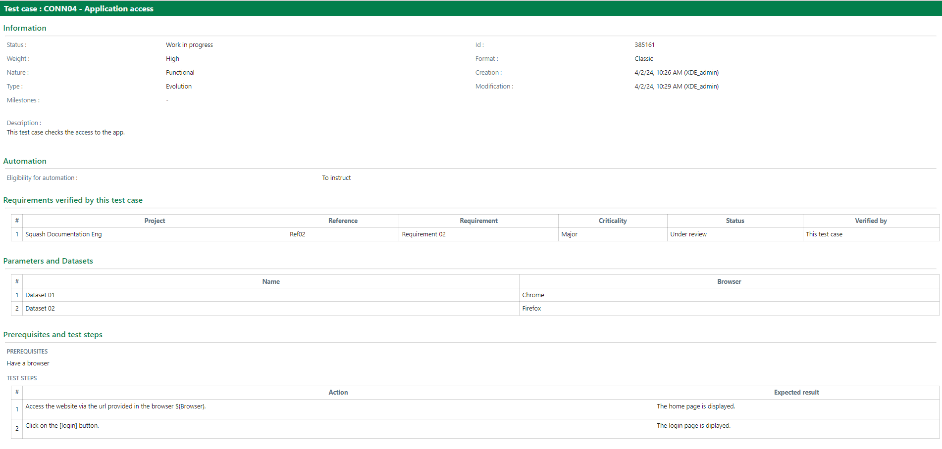 - a test case's importance, status, type, nature, eligibility for automation, automated test technology and URL of the source code repository