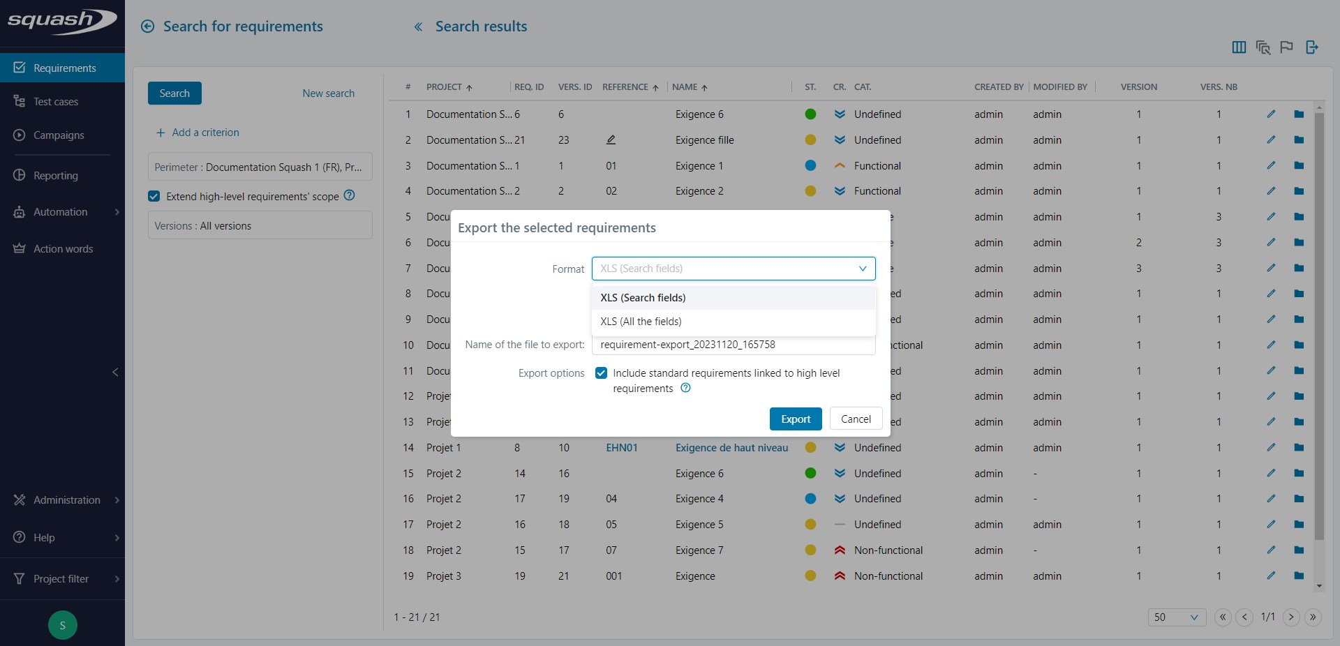 - the "Current fields" XLS format: allows you to recover the data from requirements or test cases by exporting it to an Excel spreadsheet with only the information displayed in the search results;
