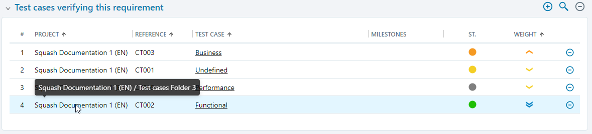 In an Execution plan, it is possible to access the direct search function and the test case search function via their requirements. The search feature is based on the requirements criteria. The results it shows are the test cases linked to requirements that match the chosen criteria.
