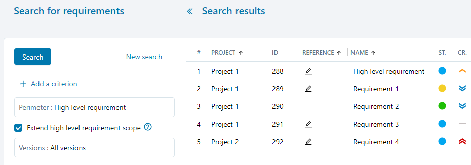 Thus, if the search perimeter you have defined is a high-level requirement or a project containing high-level requirements, this option enables you to display all the linked classic requirements, even if they are located elsewhere or in another project.