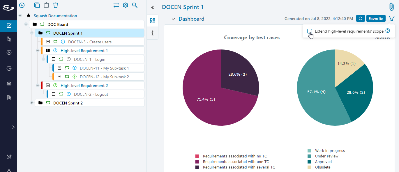 In the default and custom dashboards, an option enables you to extend the high-level requirements' scope. This way, the linked standard requirements are included in the dashboard, even if they do not fit in the initial perimeter.
