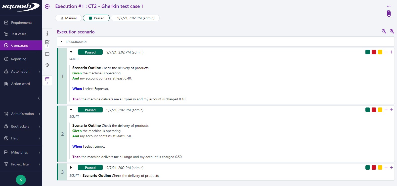 During the execution, for an automatic execution, the script is automatically replayed for each dataset. For a manual execution, a test step is created for each dataset in the execution. In the execution plan, contrarily to BDD test cases, there is not one ITPI per dataset, but only one ITPI in total. During the execution of this ITPI, the execution scenario displays as many test steps as there are datasets in the script's data table.