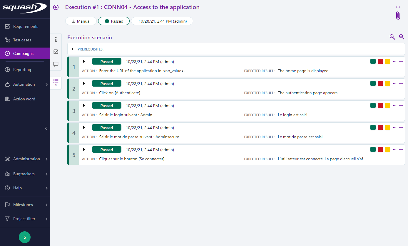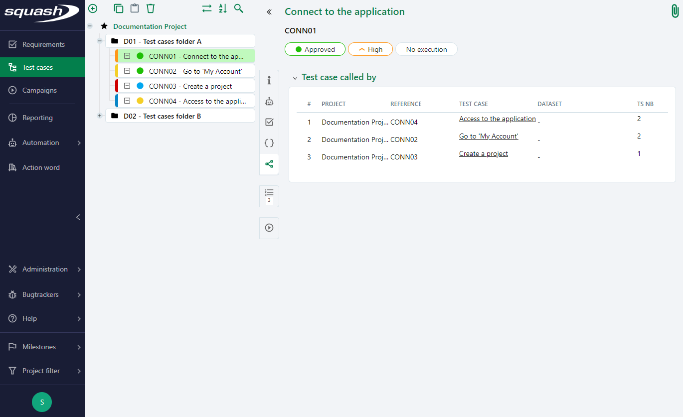 Exemple: The test case "Access application" hereunder is calling the test case "Log onto the app". During the execution, the test steps of the called test case are seen as the test steps of the calling test case.